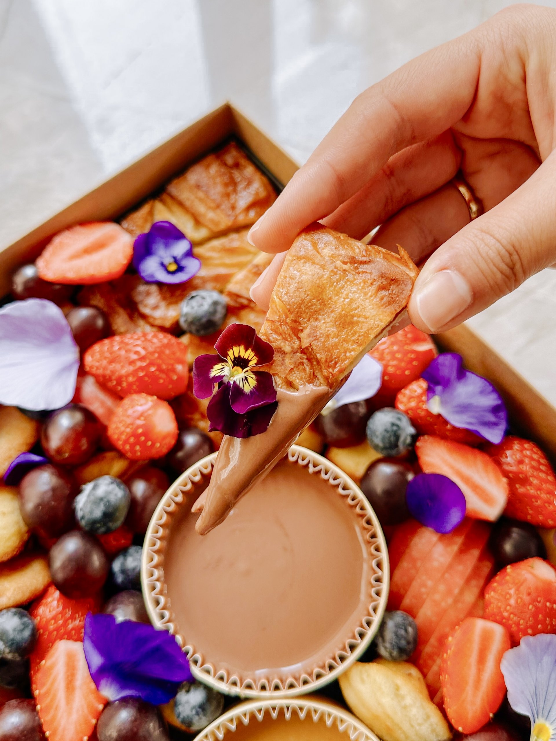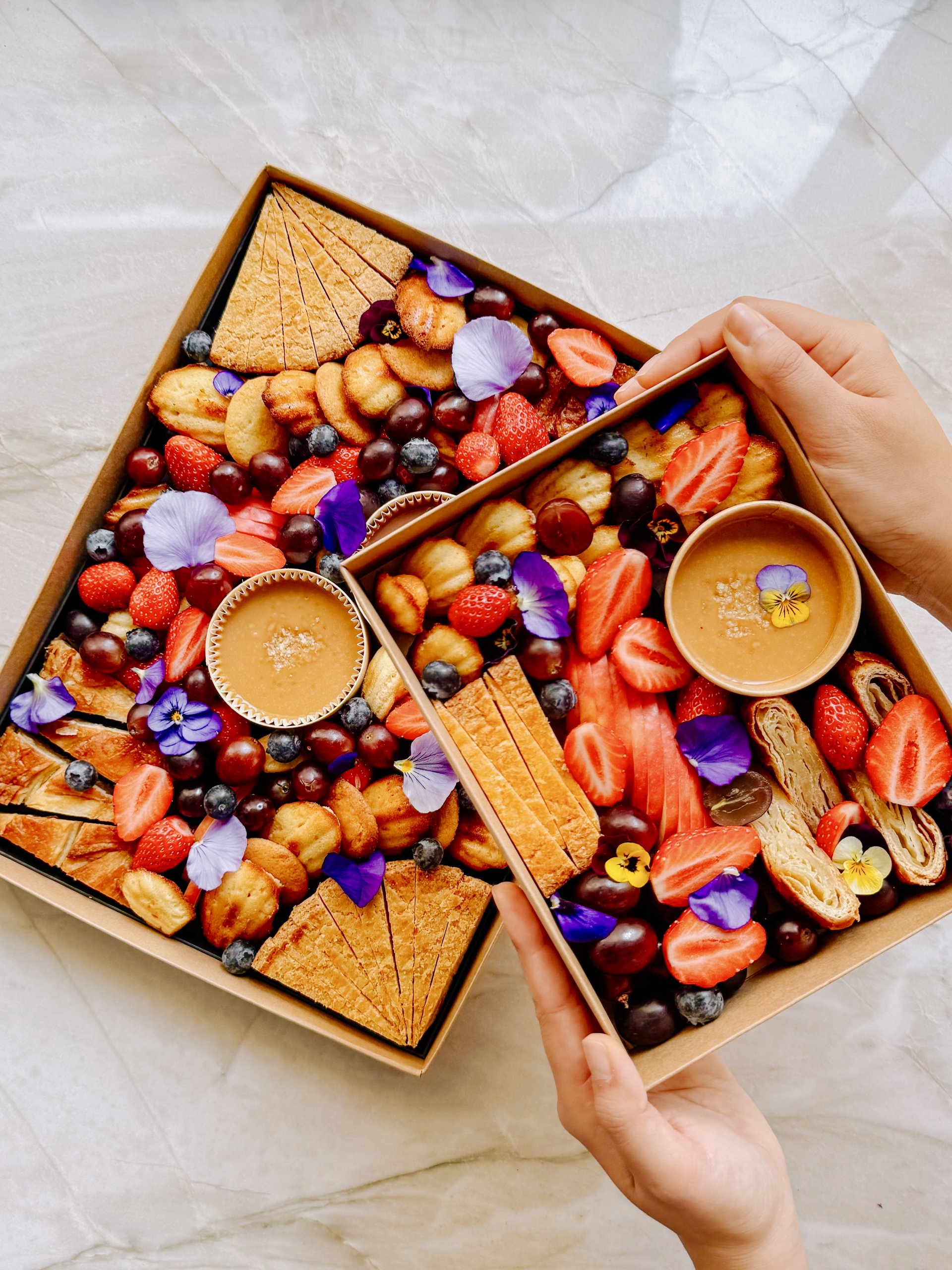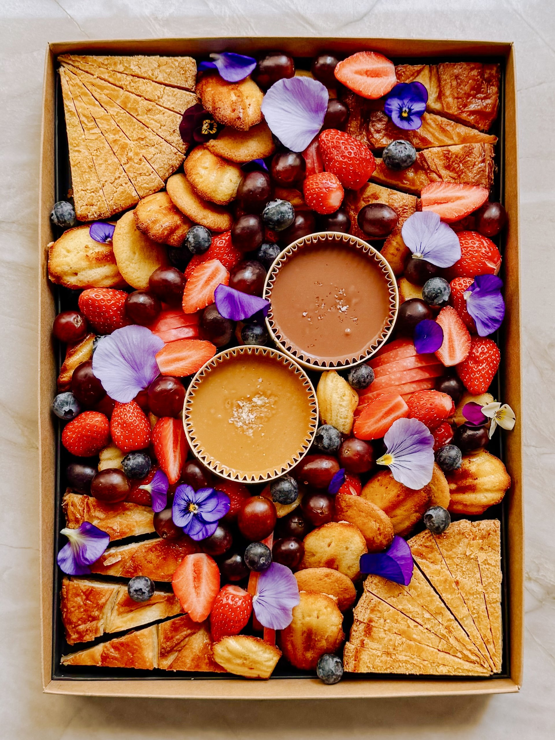 Pensé pour le partage, ce plateau se complète de grandes et mini madeleines maison, de sablés bretons maison au beurre, et de fruits frais et de saison venant apporter équilibre et fraîcheur à l’ensemble.