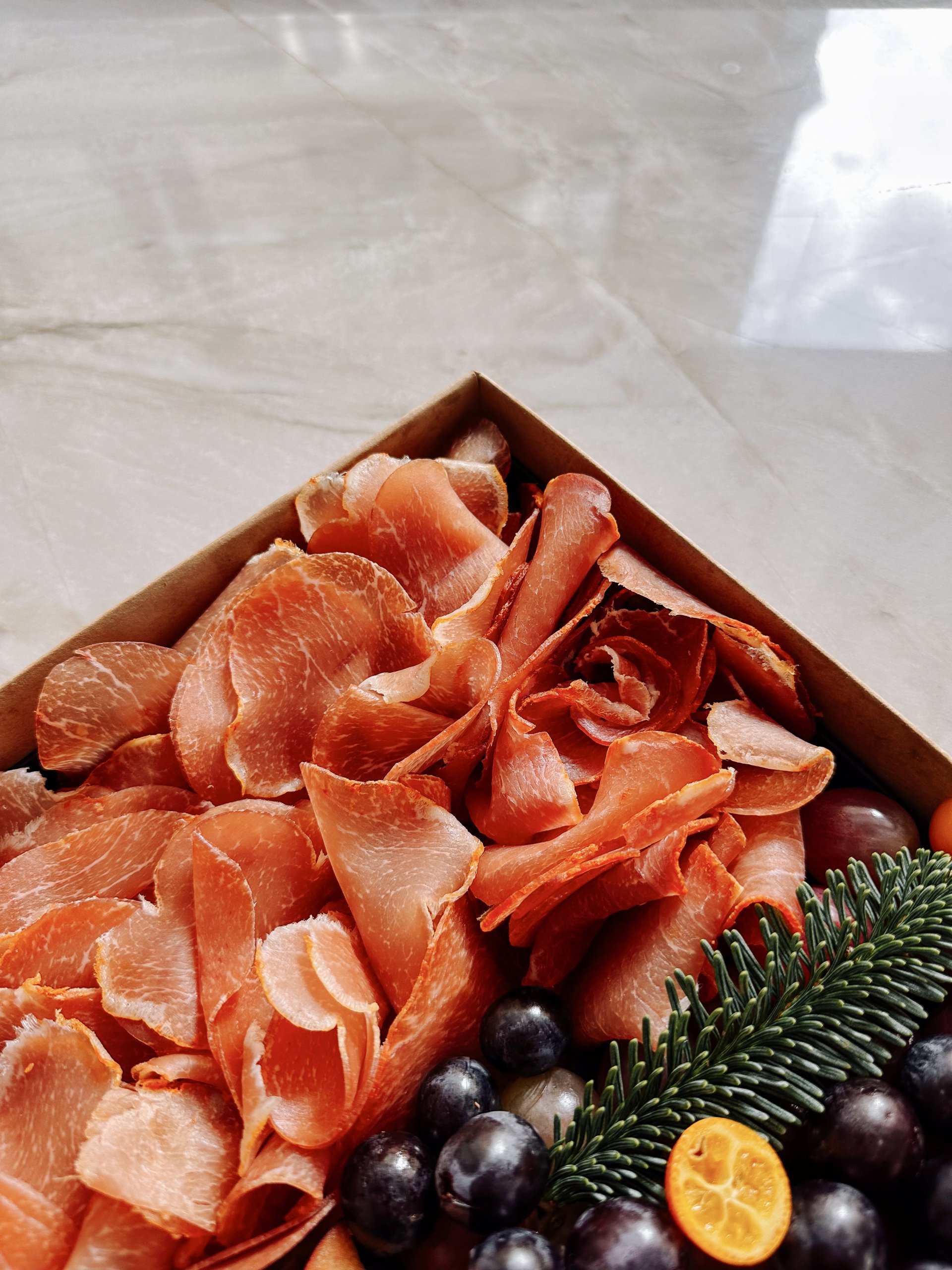 Notre plateau de chiffonnade met à l’honneur l’excellence du Lomo Ibérique, finement tranché pour révéler toute sa délicatesse. Chaque pétale de charcuterie est soigneusement disposé à la manière de rubans de soie, offrant un rendu élégant et raffiné.